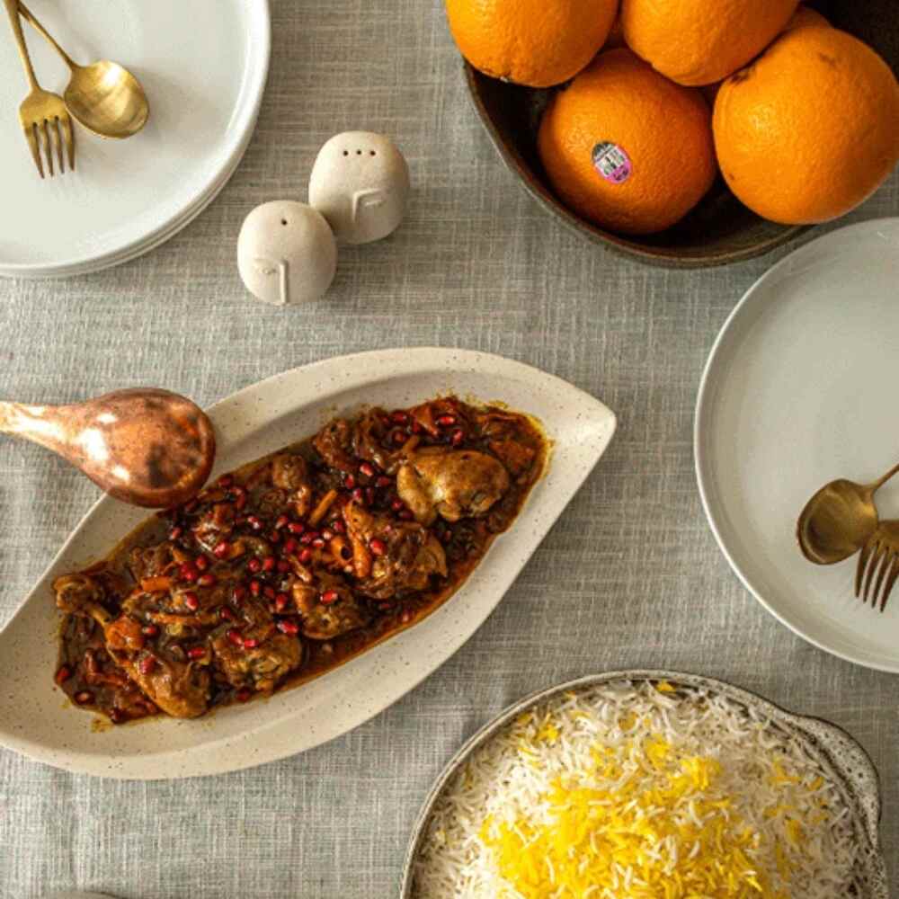 - Xào hành tây và thịt gà với 3 muỗng canh dầu cho đến khi săn và ngả vàng. Rắc 1 muỗng canh bột mì vào và xào đều tay. Thêm vỏ cam hoặc quýt, advieh, muối và tiêu. Rót nước cam vào, đậy nắp và nấu liu riu trong 35 phút.
